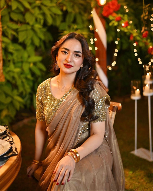 Color: ChampagneFabric: Pure net & sequins blouseStitched If you want full sleeves/quarter sleeves, please add...