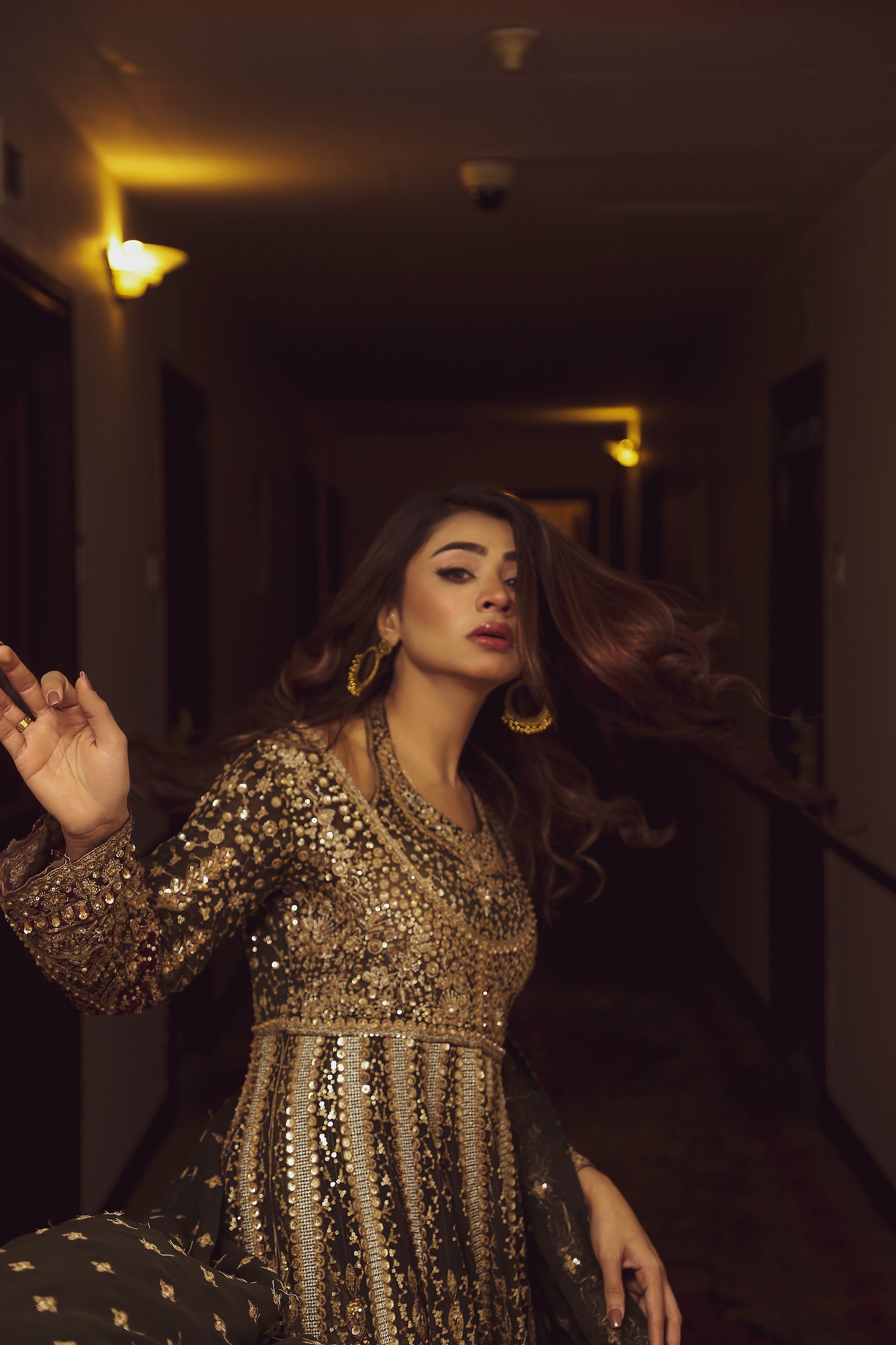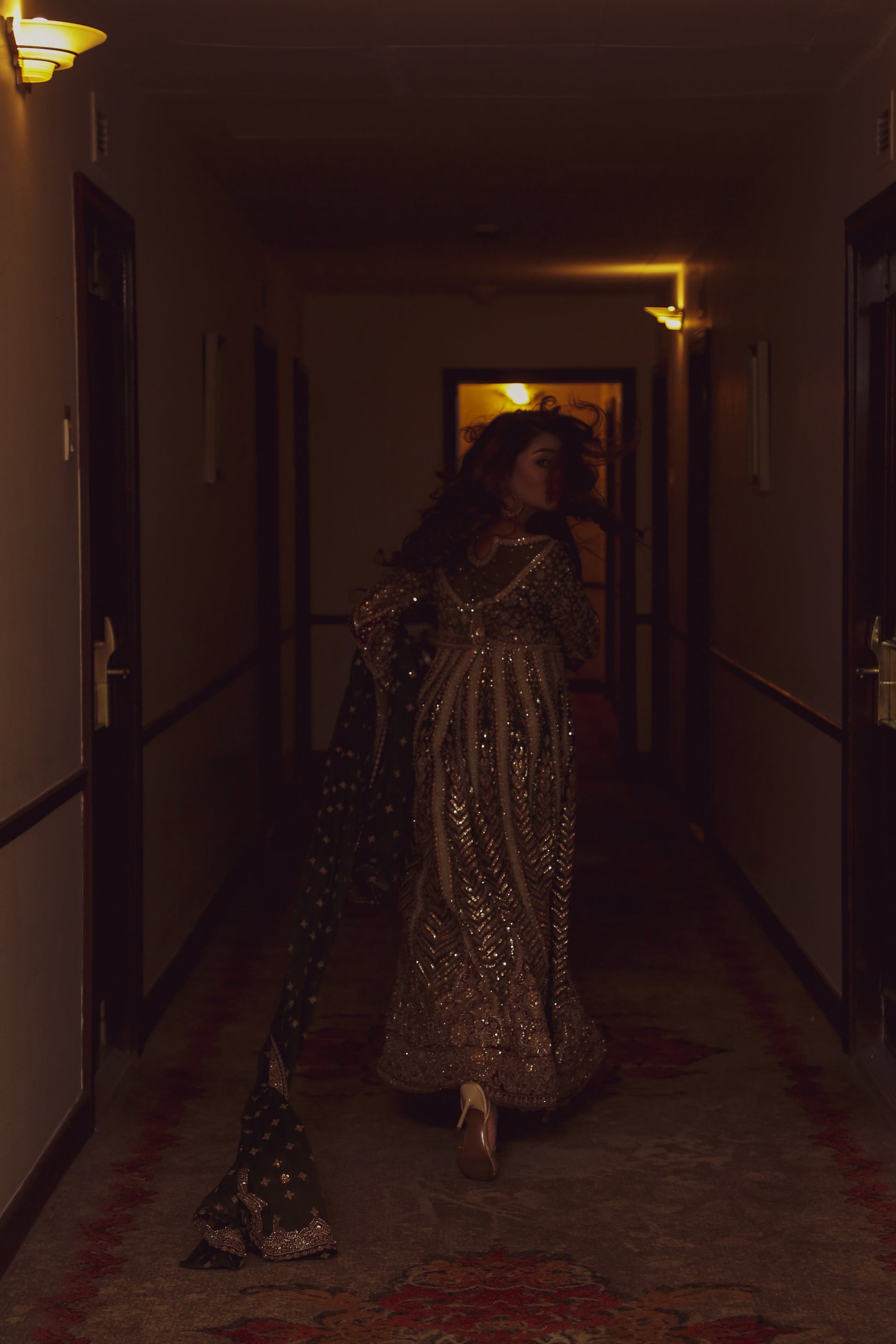 Malachite blends delicate craftsmanship with graceful structure, making it a versatile yet luxurious choice. Crafted on flowing chiffon fabric, the ensemble features a combination of machine embroidery and handwork, enhanced by a bold 5-inch embroidered border that adds definition to the silhouette. This four-piece set includes a pishwas, trousers, lining, and dupatta, offering comfort, elegance, and movement — ideal for festive occasions and formal celebrations.