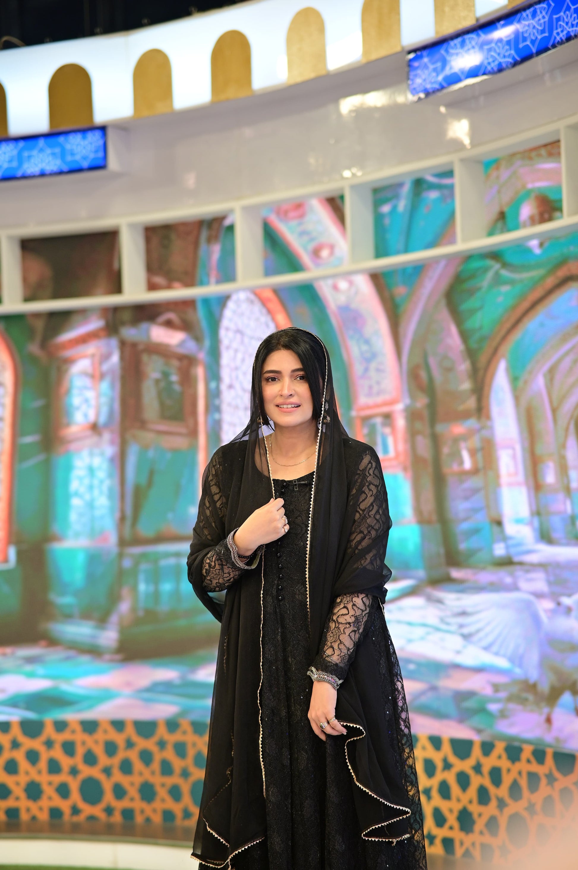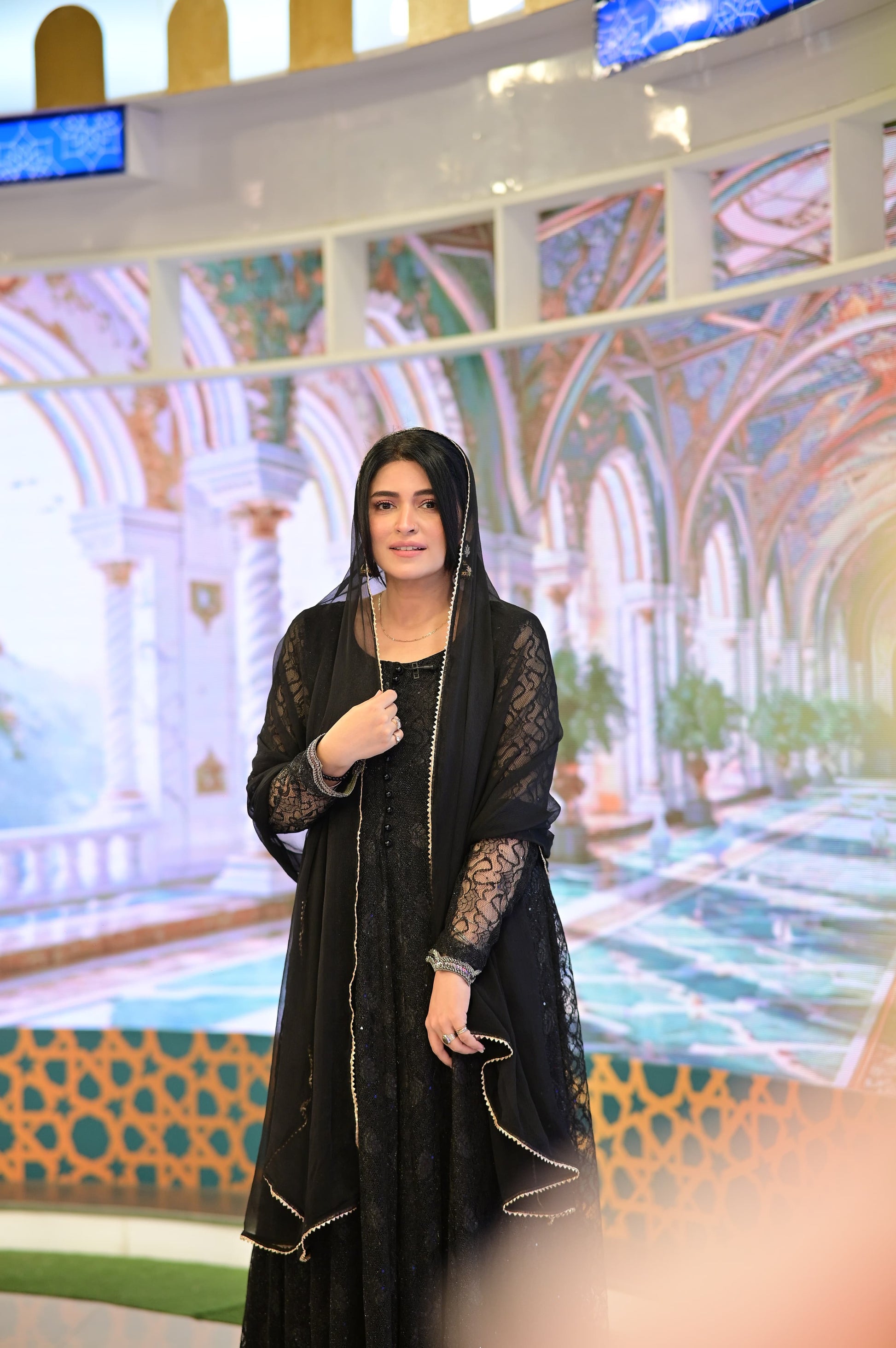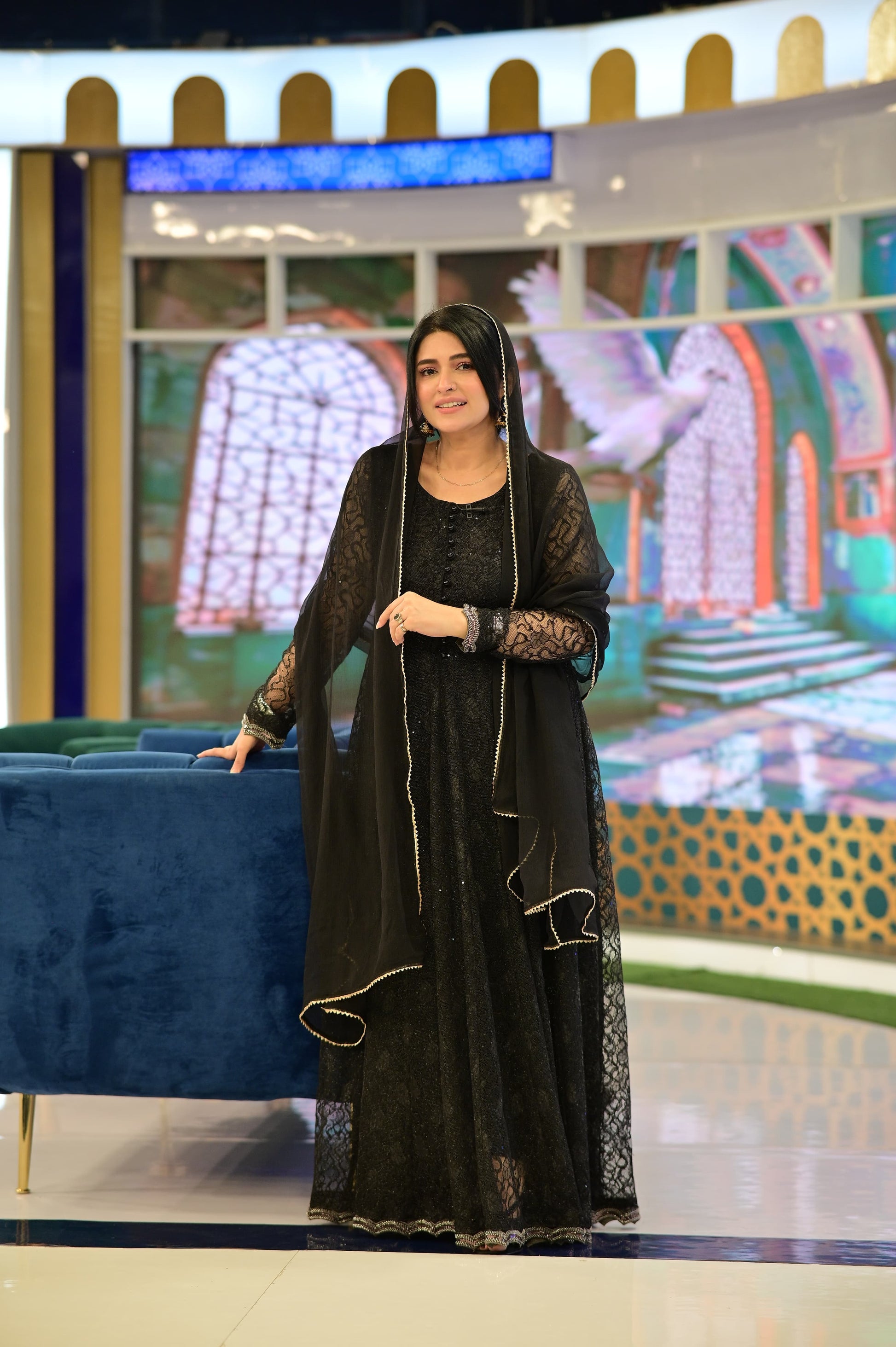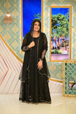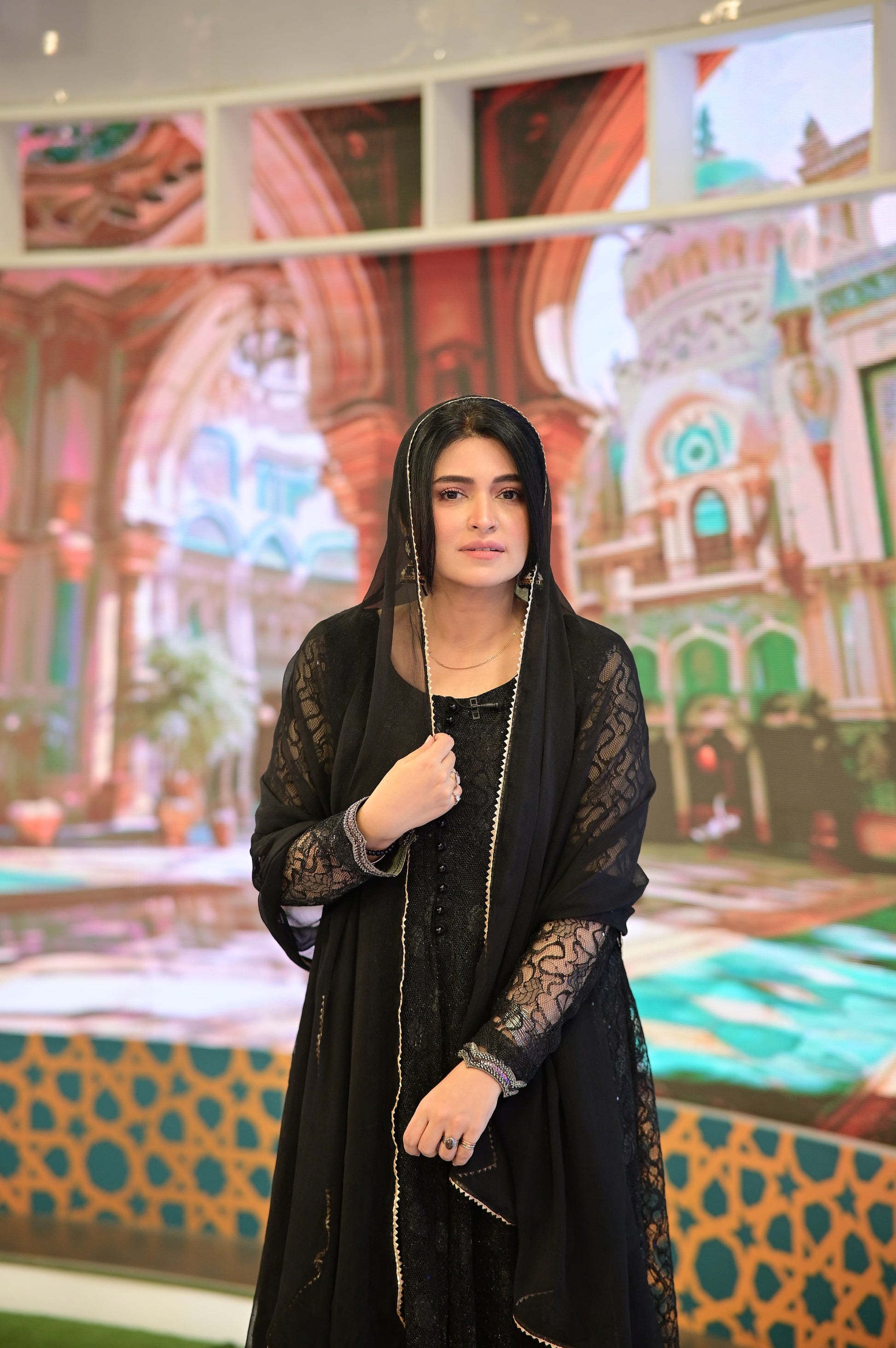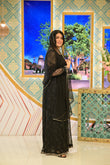 Crafted from the finest net fabric, adorned with a self-pattern, our Peshwas in timeless black exudes sophistication. Lined with sumptuous cotton silk for comfort, paired with matching trousers, and finished with a chiffon dupatta. Worn by Maya Khan in her Ramadan TV Show featuring on AAJ Entertainment and Urduflix.