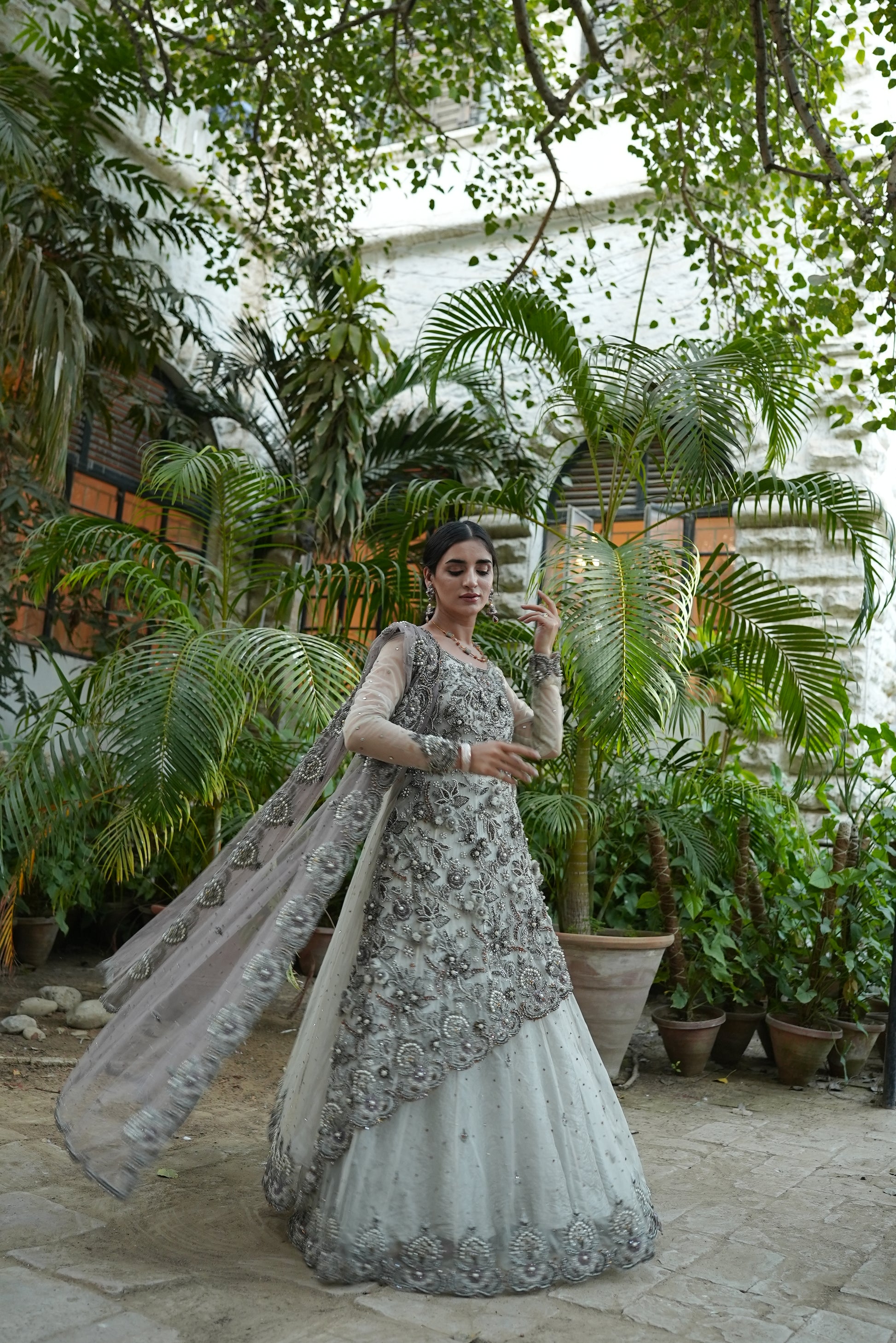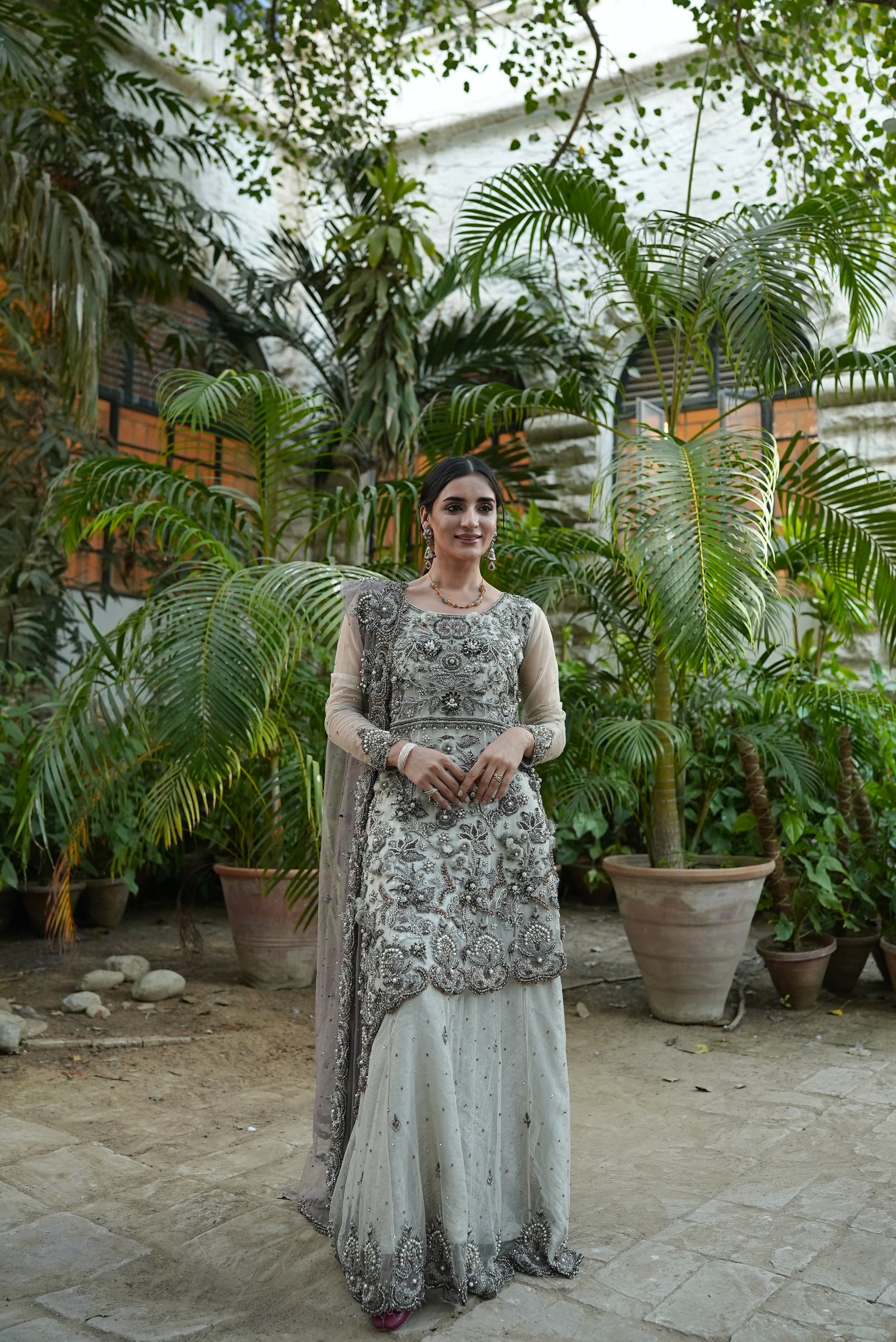 Experience ethereal grace with Miraal by Tasneem Sadaf, a bridal masterpiece that captures purity, sophistication, and timeless allure. Designed in shades of white and soft gray, this ensemble beautifully blends traditional artistry with a contemporary touch, making it an exquisite choice for the modern bride.