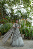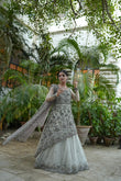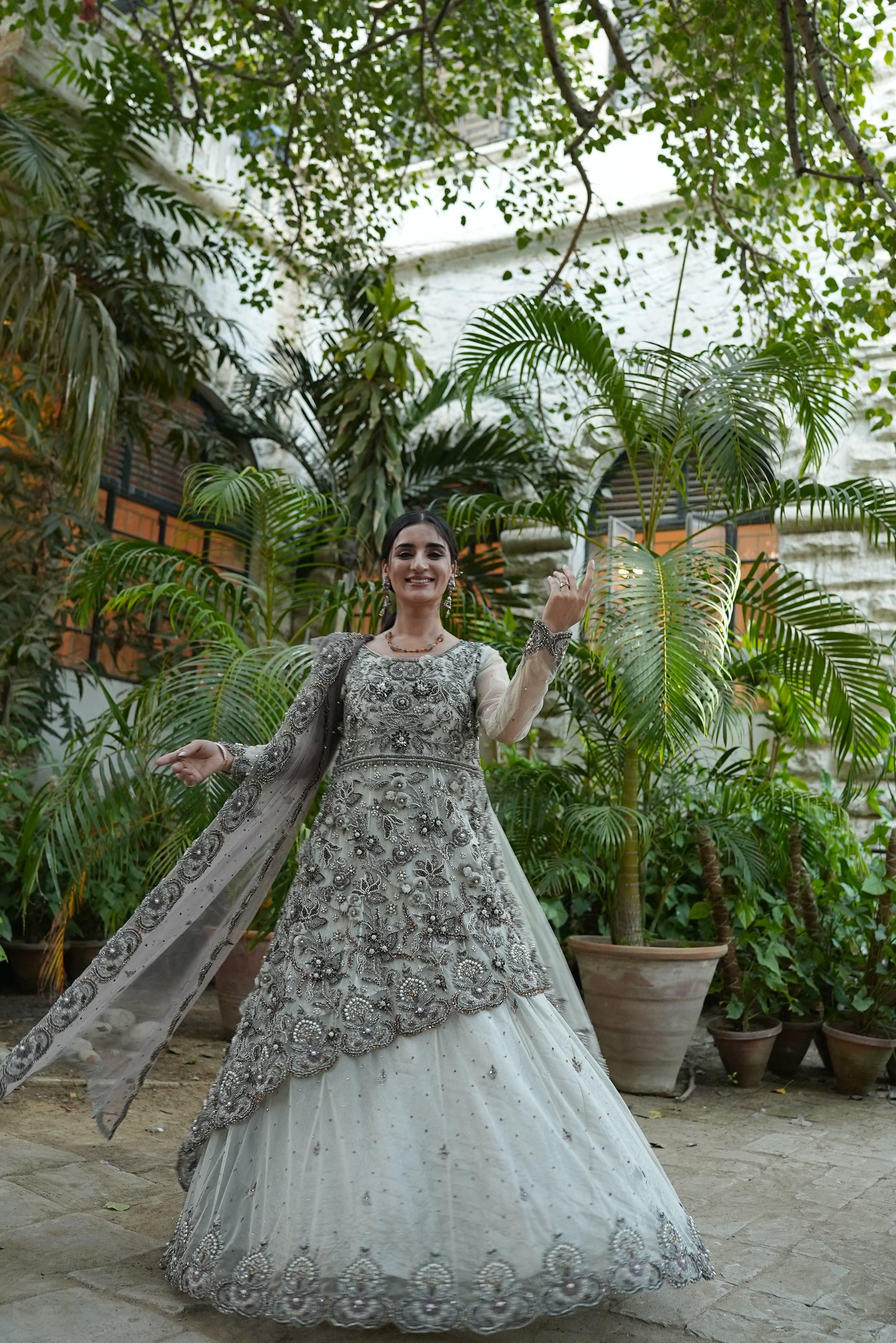 Crafted on luxurious net fabric, the outfit showcases delicate 3D handwork enhanced with diamontées, Salma, Kora, and Dabka, each detail meticulously hand-embellished to create a captivating sparkle from every angle. The heavily adorned lehenga pairs gracefully with a beautifully worked shirt, while the scalloped dupatta adds a romantic finishing touch, exuding elegance and refinement.